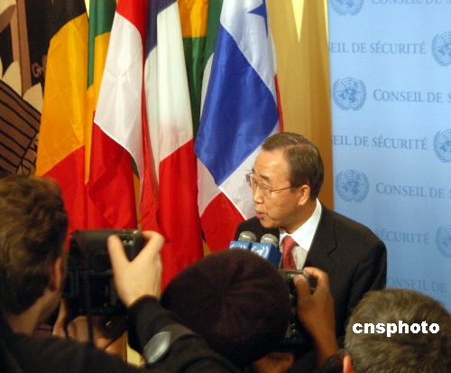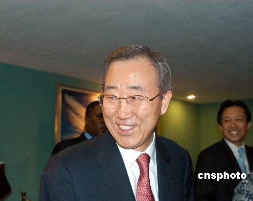 新任联合国秘书长潘基文一月二日开始他任期的第一个工作日。 图为当天上午,潘基文在简短记者会后步出大厅并向在场人们致新年好。中新社发 谭宏伟 摄