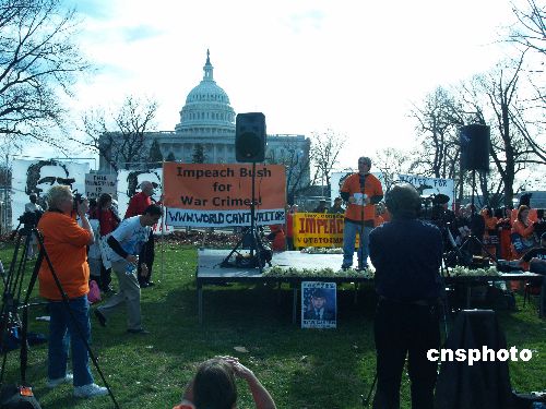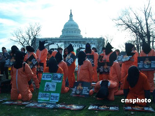 当地时间一月四日,在美国新国会开张之际,以“反战母亲”希恩为首的反战者在国会山庄外举行集会游行,要求国会施压布什政府改变伊拉克战争的政策,从伊拉克撤军。他们还要求弹劾布什,有的反战者打扮成囚犯模样,跪在地上,表达对战争涂炭生灵的不满。中新社发 余东晖 摄