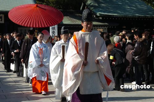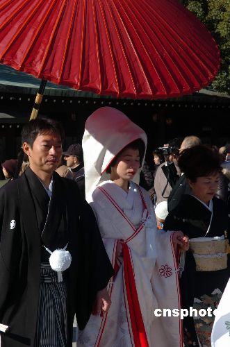 暖冬气候令一月的东京已有开春感觉,各神社内举行的传统婚礼活跃起来。图为一对参加传统婚礼的夫妇。中新社发 王健 摄