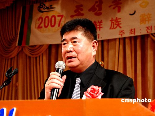 全美朝鲜族同胞会于一月二十一日在纽约举行二00七年迎春联欢会。中国驻纽约总领事刘碧伟、美东地区朝鲜族侨领和纽约朝鲜族同胞三百多人出席。图为全美朝鲜族同胞会会长元钟云致新春贺辞。中新社发 龚文谟 摄