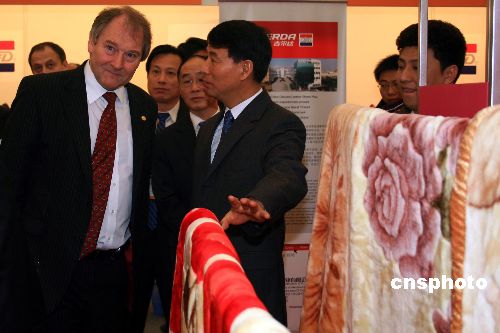 第四届“中国品牌出口商品欧洲展”当地时间二月五日在英国伯明翰春季消费品博览会上开幕,图为伯明翰市市长惠特彼(左二)和中国商务部副部长易小准(左三)等参观展馆。中新社发 李鹏 摄