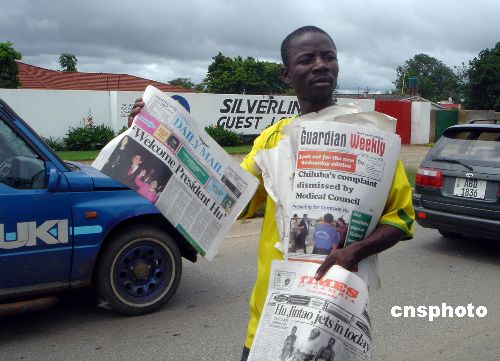 中国国家主席胡锦涛于2月11日圆满完成了对喀麦隆、利比里亚、苏丹、赞比亚、纳米比亚、南非、莫桑比克和塞舌尔等八个非洲国家的访问。图为非洲报纸在头版大篇幅报道胡锦涛此次非洲访问的新闻。中新社发 杨影懿 摄