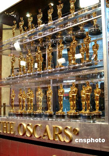 由美国电影艺术与科学学院主办的第七十九届奥斯卡金像奖颁奖典礼,将于二月二十五日晚在好莱坞的柯达剧场举行。在颁奖典礼的筹备工作进入倒计时之际,供明年奥斯卡颁奖所用的五十座小金人目前在纽约时报广场的电视直播室展出,供公众参观。组委会还首次专门提供一座多余的小金人雕像,供大众亲手接触和拍照留恋,提前体验“获奖”感受。图为展示橱窗。中新社发 邓悦 摄