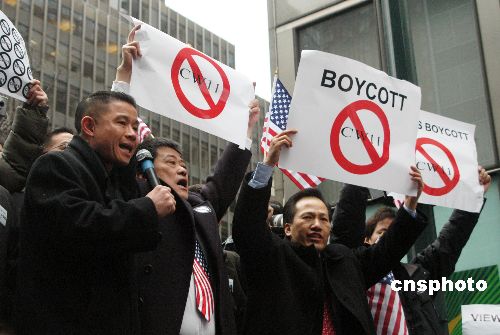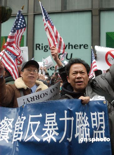 当地时间二月二十六日,纽约等地逾千名华人聚集在纽约CW11电视台前举行示威,抗议这家电视台抹黑中餐馆的不负责任报道,示威民众要求电视台做出道歉。中新社发 谭宏伟 摄