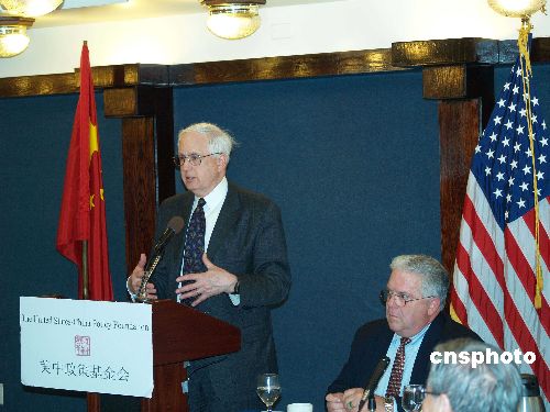 美国前驻华大事芮效俭(左)2月27日在华盛顿一个纪念上海公报35周年的论坛上指出,上海公报是上世纪一系列重大事件中少有的几个产生积极结果的一个,给所有各方带来了巨大的利益,值得每年都纪念。图为芮效俭在论坛上发言。中新社发 余东晖 摄