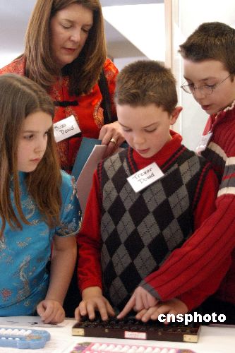 对于美国孩子,中国算盘是一种很奇异的东西。图为美国少年对中国算盘爱不释手。中新社发 邱江波 摄