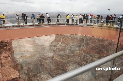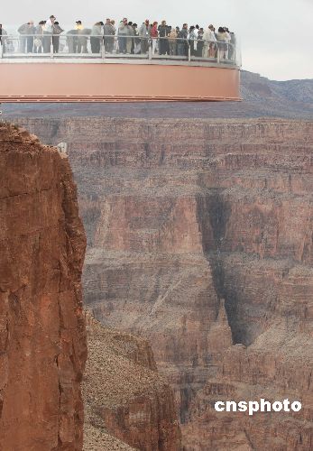 三月二十日,美国大峡谷玻璃天桥建成启用。从飞鹰峰凌空伸出21米的玻璃天桥,距谷底约1220米,此高度比目前世界上最高的建筑还要高出一倍以上。中新社发 贾国荣 摄