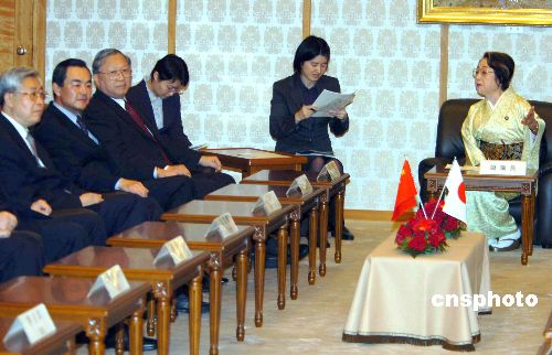 日本参议院议长扇千景二十二日下午在东京会见了率团访日的中国全国人大常委会副委员长路甬祥一行。据悉,路甬祥一行此访将正式启动中国全国人大同日本参议院的定期交流机制。期间双方将举行交流机制第一次会议,就政治安全、双边经贸关系以及能源和环保等问题进行三轮正式会谈。中新社发 王健 摄