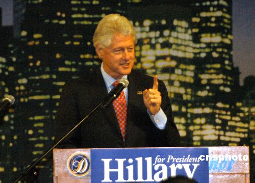 当地时间三月二十二日晚,美国前总统克林顿来到纽约市有第二唐人街之称的皇后区法拉盛,为其夫人希拉里参选二OO八年美国总统拜票筹款。近百名华裔、韩裔等亚裔选民代表参加了当晚的募款餐会。当晚的餐会由总部设在纽约的亚美商业发展中心、法拉盛商业发展中心、韩人会等机构联合举办,参会每位嘉宾至少需要支付二千美元的捐款。图为克林顿在餐会上发表演讲。中新社发 邓悦 摄