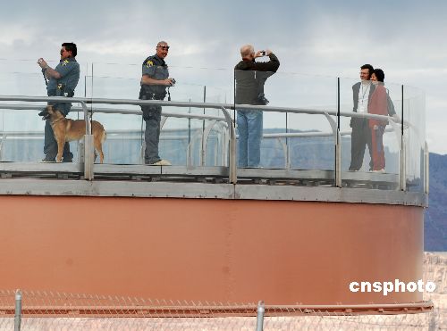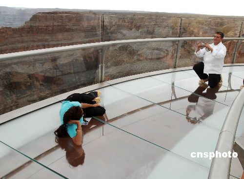 美国华裔设计师金鹉先生创意投资与华来派印第安人合作的美西大峡谷空中玻璃天桥,3月28日将正式接待游客。从飞鹰峰旁凌空伸出21米的玻璃天桥,距谷底约1220米,此高度比目前世界上最高的建筑还要高出一倍以上,堪称世界旅游新奇迹。中新社发 贾国荣 摄