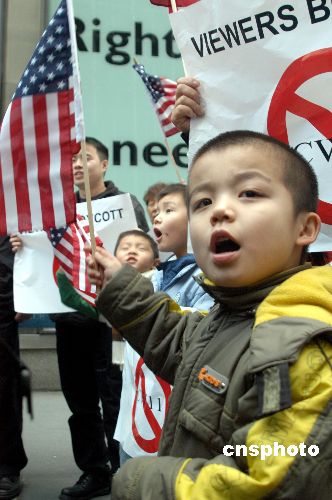 当地时间四月二日,美国纽约市近百名华裔民众在美东华人社团联合总会执行主席黄克锵等数名侨领的带领下,再次聚集在曼哈顿中城的纽约市CW11电视台总部前示威,对该台有关"新福建"中餐馆卖"芥兰鼠肉"“抹黑”报道事件继续抗议示威,这是纽约华裔社团针对CW11电视台的第三次大型示威。由于目前学校正放春假,一些华裔小童也出现在抗议活动中。中新社发 邓悦 摄