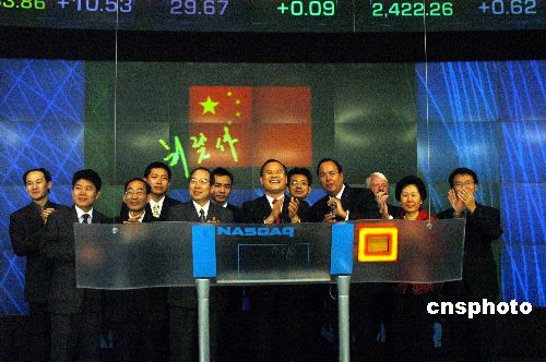 美国纽约纳斯达克交易所于纽约时间四月三日上午九点半( 北京时间当晚九点半) 在中国北京人民大会堂“遥控”举行开市仪式。图为当北京“遥控”开市的时刻到来之际,纽约纳斯达克 MarketSite 圆形大厅的演播室大型屏幕前,中国驻纽约总领事刘碧伟(前排左四)大使、纳斯达克公司法律总顾问卡特(前排左三)等中美双方的代表鼓掌庆贺。中新社发 邓悦 摄
