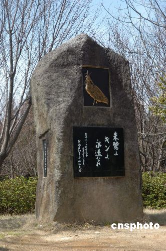 根据四月十一日在东京发表的《中日联合新闻公报》,中国将再度赠送日本两只朱鹮。日本由于十九世纪末叶开始的滥捕和生态破坏,原产朱鹮渐渐灭绝。图为在日本佐渡朱鹮保护中心朱鹮森林公园内为纪念二○○三年死去的日本最后一只原产朱鹮而树立的石碑。中新社发 王健 摄