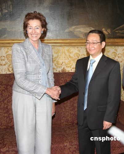 当地时间4月17日下午,中国驻米兰总领馆总领事张利民(右)与米兰市市长毛纳蒂举行会谈,协商解决最近发生的华商与警察发生冲突的事件。中新社发 欧侨 摄