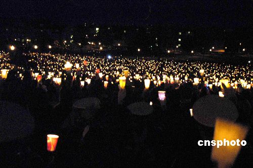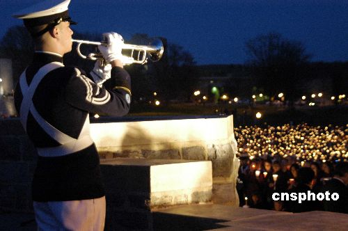 当地时间4月17日晚,弗吉尼亚理工大学校园举行万人烛光晚会,送别校园枪击案中的死难同学。中新社发 邱江波 摄