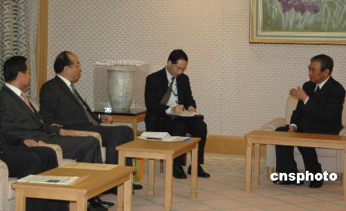 4月18日下午,日本众议院议长河野洋平(右)在东京会见以赵启正(左二)为团长、熊光楷为副团长的中国外交学会代表团一行。中新社发 朱沿华 摄