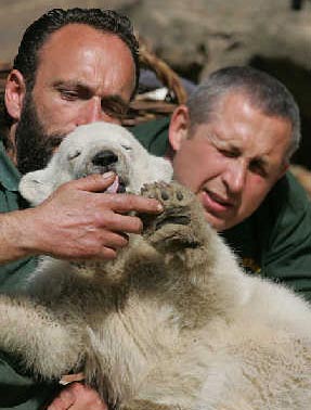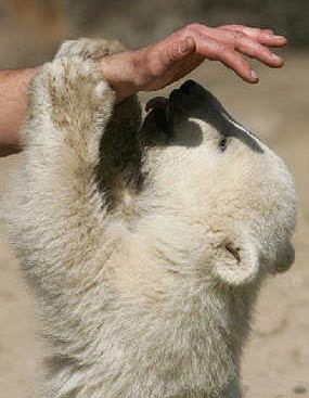 4月19日,在德国柏林动物园,小北极熊“克努特”与看护人员玩耍。德国柏林动物园19日加强了安全警戒,原因是动物园收到威胁小北极熊“克努特”的一封死亡恐吓信,上写:“克努特必死!19日中午。”出于安全考虑,动物园把小北极熊的看护人员增加了两倍,达到15人。