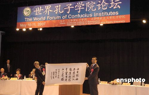 5月10日上午,首届世界孔子学院论坛在日本京都立命馆大学召开,孔子学院总部理事会副主席陈进玉、孔子学院总部理事会总干事许琳、中国驻日使馆大使王毅等嘉宾出席,来自世界二十八个国家和地区的七十多所大学的五十多所孔子学院的华文教育专家及相关人士参加。图为王毅大使与立命馆大学校长川口清史共同展示中国温家宝总理参观立命馆大学时的题词。中新社发 滕剑峰 摄