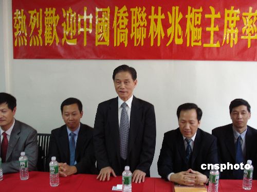 应中国驻纽约总领事刘碧伟大使的邀请,中国侨联主席林兆枢一行六人当地时间五月十日抵达纽约进行访问,十一日,林兆枢一行访侨社、会侨胞,说家常,话友情。图为林兆枢(中)在美东华人社团联合总会访问。中新社发 张碔 摄