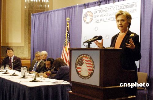 5月16日,美国总统参选人、民主党籍美国国会参议员希拉里·克林顿在亚太传统月活动上说,她和民主党人非常关注亚太裔美国人的权益,包括移民问题、教育问题等。她认为:“这个议题十分重要,已经不单单只是一个社区话题,这是个全国性的话题。中新社发 邱江波 摄