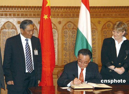 中国全国人大常委会委员长吴邦国23日在布达佩斯与匈牙利国会主席西里(右一)会谈,图为会谈结束后吴邦国在国会贵宾册上签名。中新社发 应妮 摄