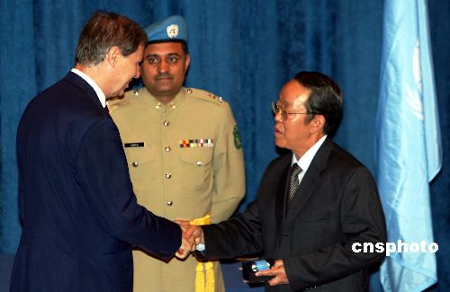 当地时间五月三十日,为纪念“联合国维持和平人员国际日”,联合国在总部举行仪式,向2006年在维和行动中殉职的军人、警察和文职人员追授达格·哈马舍尔德勋章。去年在黎巴嫩遇难的中国军人杜照宇是107名被授予勋章的维和人员之一。图为中国常驻联合国大使王光亚代表杜照宇接受勋章。中新社发