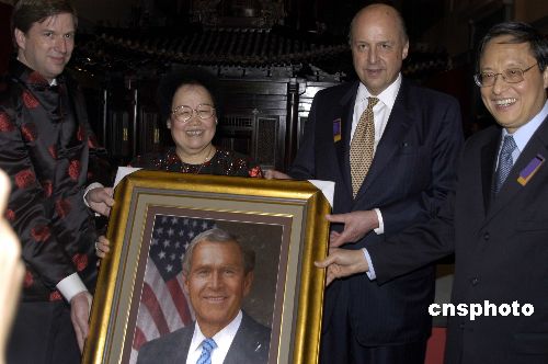 当地时间5月30日,中国全国政协委员、北京中国紫檀博物馆馆长陈丽华博士(左二)在华盛顿向美国史密森学会博物馆赠送中国手工刺绣作品《布什总统像》,美国常务副国务卿内格罗蓬特(右二)、中国驻美大使周文重(右一)参加赠送仪式。中新社发 邱江波 摄