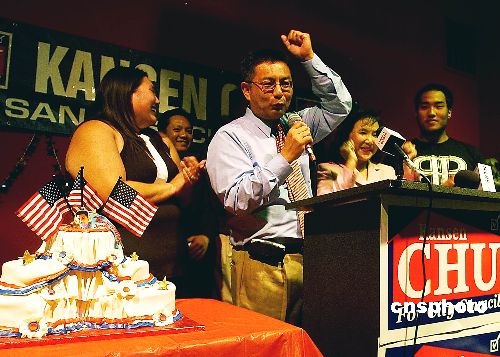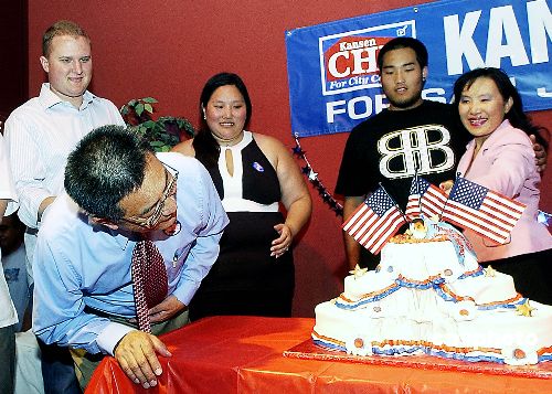 当地时间六月五日,加州圣荷西举行第四区议员选举,华裔候选人朱感生获胜。他是该市一百五十七年来第一位华裔市议员。图为朱感生和家人在竞选总部庆贺胜利。中新社发 陈钢 摄