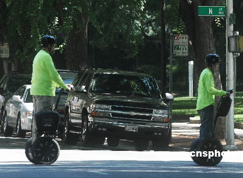 六月中旬,美国一队推广单人环保电动车的宣传员在加州首府沙加缅度大街上四处奔波。中新社发 贾国荣 摄