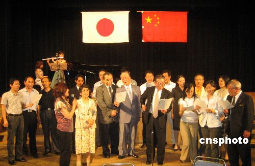由日本东京都北区日中友好协会主办的促进交流恳谈会,6月15晚在东京举行,中日两国100多名友好人士出席,共商声援2008北京奥运事情。图为中日大合唱《大海啊故乡》。中新社发 段跃中 摄