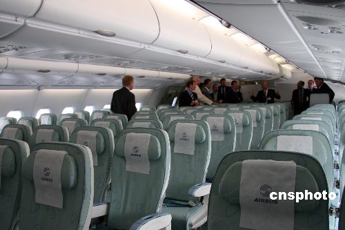 6月,空客A380在第47届巴黎国际航展上全面亮相,其中一架飞机在现场进行飞行表演,另一架则向客户开放机舱,以便其了解飞机的内部情况。图为航展客户参观A380宽大的机舱二层普通仓。巴黎航空展6月18日在巴黎北郊布尔歇机场开幕以来,“主场作战”的空中客车便大出风头,主打中型机A320、A350和巨型客机A380均获新订单。空中客车06年以来深陷麻烦。巨型客机A380的交货日期一推再推,再加上欧元持续坚挺,新增订单霸主宝座去年被波音夺回,空客被迫大规模重组。巴黎航展第一天的大批订单让空客看到再现辉煌的曙光。中新社发 钟诚 摄