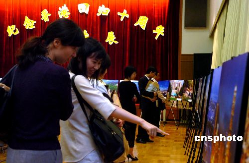 6月26日,中国驻日使馆举行“纪念香港回归十周年”图片展,在日华侨华人踊跃参观。中新社发 滕剑峰 摄