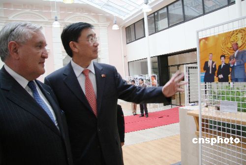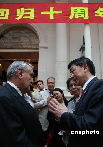 中国驻法使馆6月26日在巴黎举行香港回归十周年图片展,法国前总理拉法兰在中国驻法大使赵进军的陪同下参观图片展。当天,众多法国各界人士和旅法华侨华人代表出席了图片展开幕仪式。中新社发 钟诚 摄