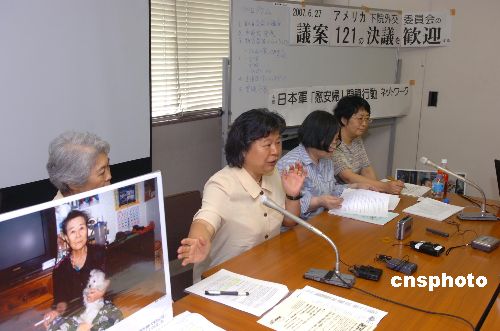6月27日,日本各民间团体纷纷就美国众议院外交委员会通过关于慰安妇问题的121号决议案表示欢迎。图为“日本军‘慰安妇’问题行动组织”发表欢迎声明的会议现场。中新社发 滕剑峰 摄