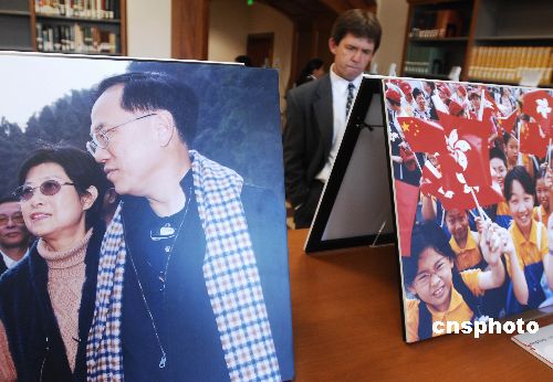美国西部时间六月二十七日,洛杉矶南加州大学具有近八十年历史的多荷尼图书馆里举办庆祝香港回归十周年图片展,各界来宾漫步在古色古香的书架间,欣赏摆放其间的精彩照片。中新社发 贾国荣 摄