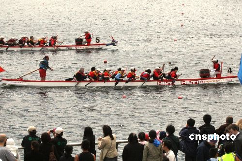 当地时间七月一日,香港驻伦敦经贸办事处、伦敦华埠狮子会、伦敦华埠商会联合主办“伦敦香港龙舟同乐日”,庆祝香港回归十周年。图为比赛现场。中新社发 李鹏 摄
