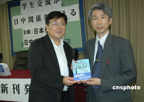 | 为纪念中日邦交正常化35周年和人民日报创刊60周年,日本侨报社于7月4日发行新书《必读:有趣的中国》。据悉,该书是从2006年《人民日报》刊登的诸多评论和报道中筛选出60篇文章,由日本“而立会”翻译成日文出版,以期向日本读者展示一个真实和丰富多彩的中国。图为“而立会”会长、丽泽大学教授三潴正道(右)向《人民日报》东京支局长于青赠送样书。中新社发 段跃中 摄