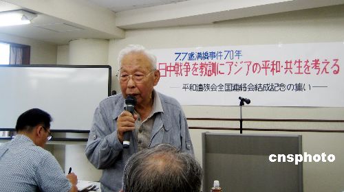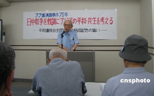 由日本和平遗族会全国联络会主办的纪念“七七卢沟桥事变”70周年反战集会,7月7日下午在东京举行,各界代表120人参加。原侵华日本兵金子安次、日本和平遗族会全国联络会事务局长西川重则先后在会上发言,呼吁反省侵华战争,思考亚洲和平与共生。
