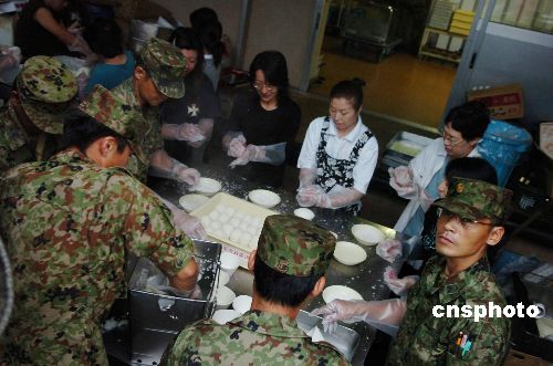 日本新潟地区发生强烈地震后,政府派遣自卫队前往灾区支援。图为7月18日早晨五点半,自卫队员与志愿者一起为避难所的市民作早餐用的饭团。中新社发 朱沿华 摄