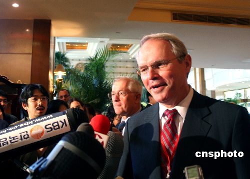 7月19日上午,美国代表团团长、助理国务卿希尔在北京国际俱乐部接受记者采访时表示,六方会谈需各方继续努力。中新社发 李美丹 摄