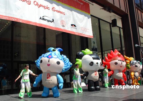 当地时间八月七日,“迎接二00八年北京奥运倒计时一周年”庆祝活动在芝加哥市中心的戴利广场举行。来自芝加哥和伊利诺州的数百名市民和华侨华人参加了当天的庆祝活动。图为奥运吉祥物“福娃”来到了芝加哥。中新社发 张大卫 摄