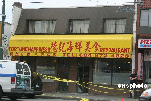 当地时间八月九日凌晨四点半左右,两个蒙面男子冲进位于温哥华东区东百老汇街通宵营业的中餐馆“德记海鲜美食”,向一桌食客开枪扫射。同桌的四男四女共八人中枪,两人当场死亡,六人受伤送院,其中一人伤势危殆,枪手犯案后逃去无踪。图为枪案发生后警方关闭餐馆进行调查。中新社发 吕振亚 摄