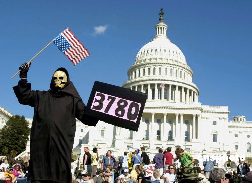 当地时间八月十五日,华盛顿爆发大规模反战示威。 图为一个身穿骷髅服装的示威人士,在国会山前举起国旗和3780的数字牌,那是被死亡之神夺走的美军将士的人数。中新社发 邱江波 摄