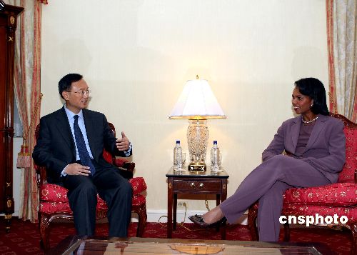 当地时间九月二十三日上午,正在纽约出席第六十二届联合国大会的中国外长杨洁篪会见美国国务卿赖斯。中新社发 谭宏伟 摄