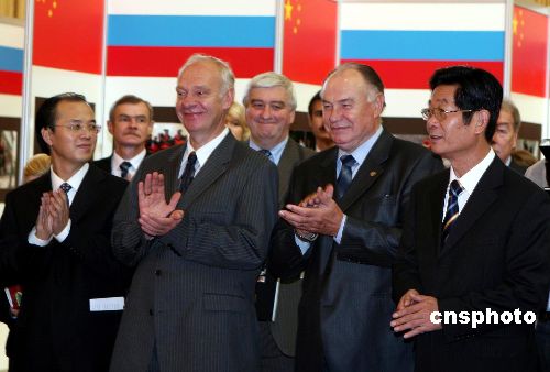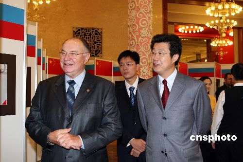 九月二十四日,中俄“国家年”摄影比赛优秀作品展开幕式在中国驻俄大使馆举行。比赛于二00六年八月至十月进行,来自两国主流媒体的七位摄影记者分别在对方国家进行了拍摄。图为中国国务院新闻办国际局副局长、俄罗斯“中国年”中国新闻中心主任丁小鸣陪同俄中友协主席、俄科学院远东研究所所长吉塔连科参观开幕式上展出的一百余幅反映中俄人文历史、自然风光、文化交流以及现代时尚的优秀作品。中新社发 田冰 摄