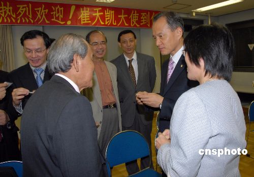 图为崔天凯大使和华侨华人交流。10月9日下午,中国新任驻日大使崔天凯向日本外务省递交国书副本后立即来到东京华侨会馆,看望东京、横滨两地的新老华侨华人代表并和大家座谈。5日抵达东京的崔天凯、作为新任大使参加的第一场活动选择与旅日侨胞座谈,受到与会者的高度评价。于淑媛总领事主持了座谈会。中新社发 段跃中 摄