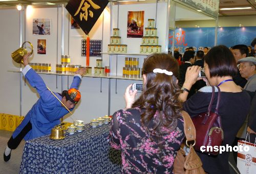 10月11日上午,中国浙江省日本池袋太阳城举行“2007浙江省中华老字号日本展”,来自中国浙江48家“中华老字号”企业走出国门齐聚东京,让日本国民近距离接触3000多个品种的中华老字号精品,感受浙江历史悠久、底蕴深厚的商业文明。图为浙江老字号“太极茶”的茶艺表演,吸引日本民众前来观看、拍照。中新社发 滕剑峰 摄