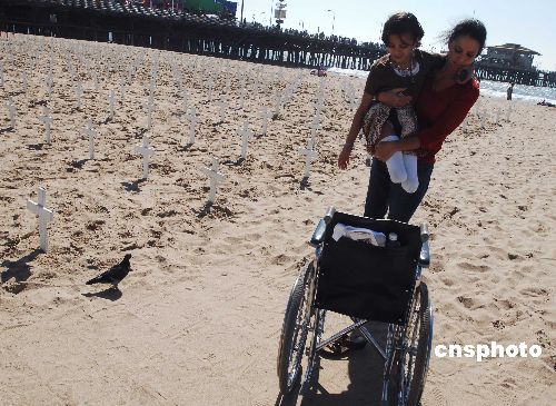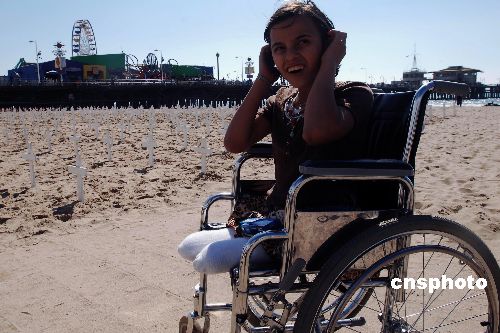 被战火夺去双腿的十岁伊拉克女孩萨利·阿拉维,十月中旬来到美国洛杉矶最美丽海滩之一的圣塔莫尼卡,访美五天里为同样在战争中受重伤的姐姐筹集治疗款。她去年十一月七日与哥哥姐姐和朋友们在家门口玩耍时遭到导弹袭击,哥哥当场被爆炸夺去生命,姐姐腿部受到重伤。中新社发 贾国荣 摄