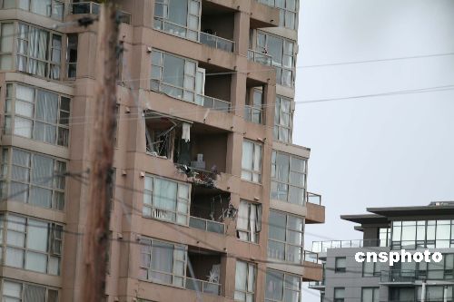 加拿大温哥华地区列治文市发生一起飞机撞进居民楼事故,造成飞行员死亡和两名住户受重伤。事故发生在当地时间十月十九日下午四点十分左右,一架双引擎小型飞机撞进了位于列治文公众市场附近的玫瑰园二期公寓楼,窗口被撞击后留下大约五米乘八米的大洞。据悉,华人占列治文市人口总数近一半,此楼大部分居民为中国移民。图为飞机撞击公寓楼后的情形。中新社发 罗琦 摄