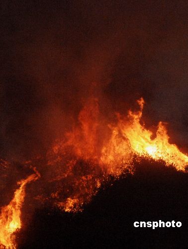 美国加州火灾最重的圣地亚哥,海军陆战队大本营所在地的十月二十四日还在燃烧。连日肆虐的山火目前已造成至少十亿美元的经济损失,近一百万民众被下令疏散到各个避难收容场所。布什总统将改在周五前往加州灾区视察。中新社发 贾国荣 摄